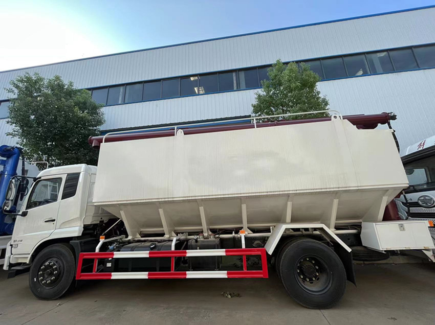 散裝飼料運(yùn)輸車,散裝飼料車的飼料罐架設(shè)在卡車的底盤上,罐頂開有進(jìn)料口.頂部的一根螺旋輸送卸料管(俗稱卸料絞龍)則可自由回轉(zhuǎn)和抬升,抬升的仰角可達(dá)60度。運(yùn)輸時(shí),頂部的螺旋管平臥在罐頂;卸料時(shí)則抬起,使管端的出料口與畜禽飼養(yǎng)場貯料罐頂部的進(jìn)料門相接,駕駛室內(nèi)裝有操縱裝置(操縱裝置也可裝置在罐體尾部),卸料時(shí)通過車底的動力輸出軸和減速器來驅(qū)動螺旋,以完成卸料。