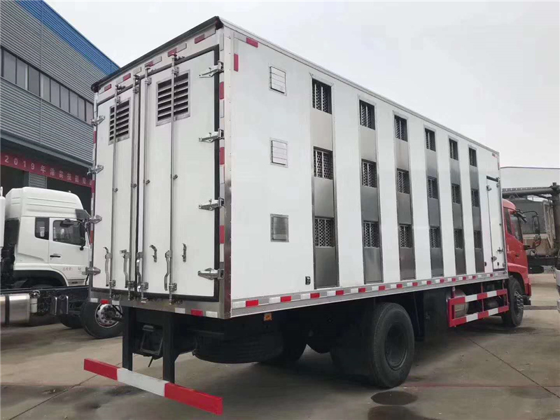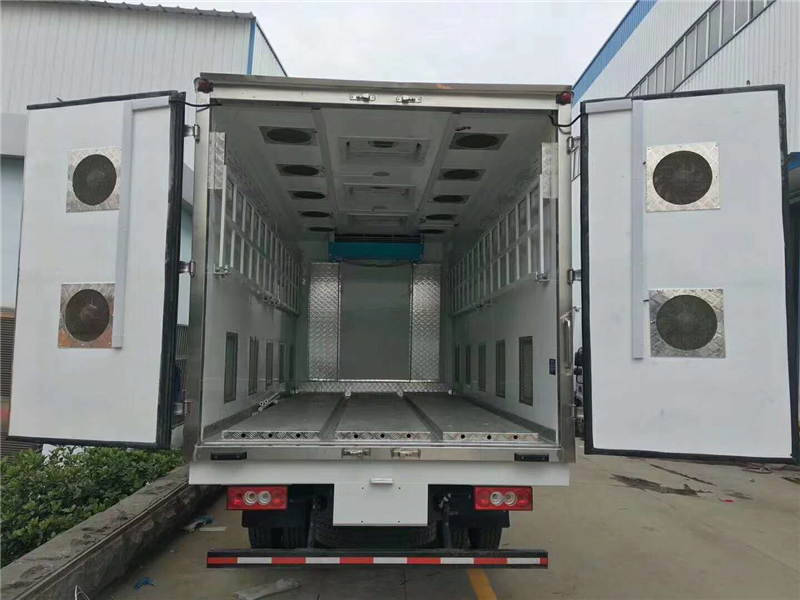 【豬苗車】上裝配置外玻璃鋼,內(nèi)不銹鋼,兩層液壓升降層板,尾部液壓翻轉(zhuǎn)上豬平臺,層板為不銹鋼骨架鋪鋁花紋板。外部電動(dòng)升降窗,排氣扇,柴油發(fā)電機(jī),暖風(fēng)加熱,喂水系統(tǒng),凈水箱、污水箱,箱內(nèi)攝像頭監(jiān)控,倒車影像,凱利制冷機(jī)組。(油暖加熱為選裝部件)