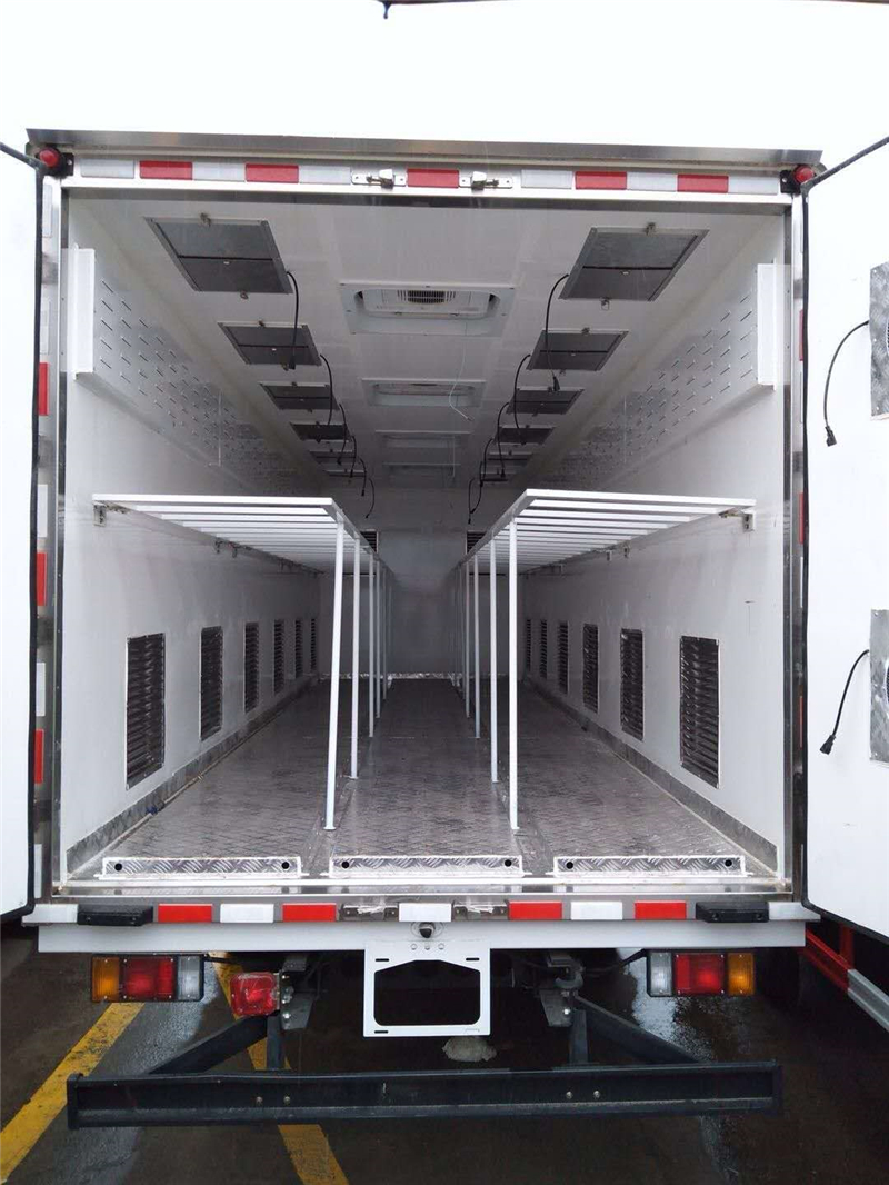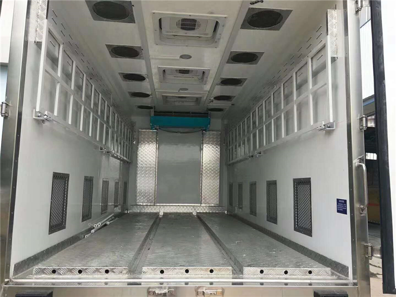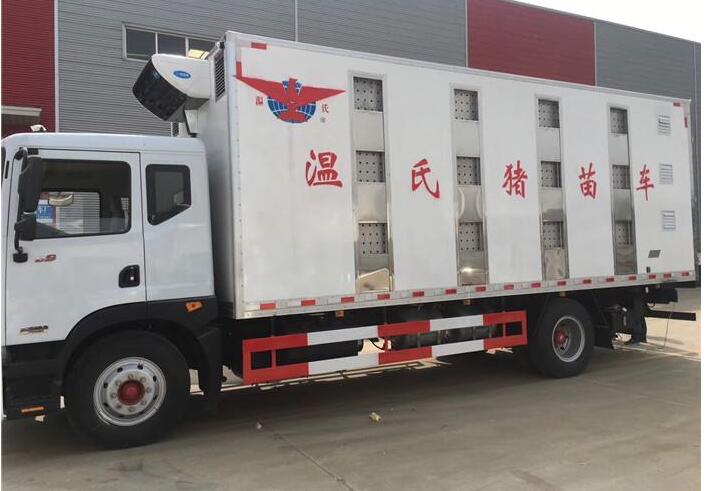 【豬苗車】上裝配置:外玻璃鋼,內(nèi)不銹鋼,兩層液壓升降層板,尾部液壓翻轉(zhuǎn)上豬平臺,層板為不銹鋼骨架鋪鋁花紋板。外部電動(dòng)升降窗,排氣扇,柴油發(fā)電機(jī),暖風(fēng)加熱,喂水系統(tǒng),凈水箱、污水