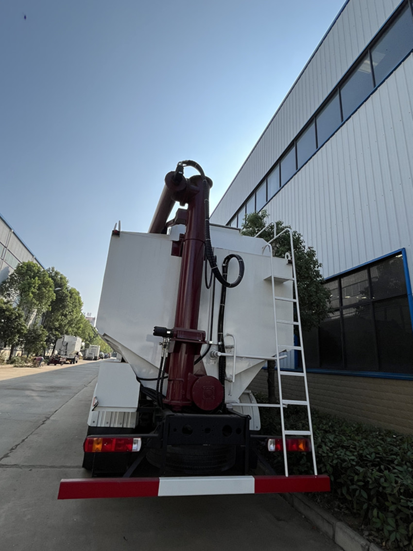 散裝飼料運(yùn)輸車,散裝飼料車的飼料罐架設(shè)在卡車的底盤上,罐頂開(kāi)有進(jìn)料口.頂部的一根螺旋輸送卸料管(俗稱卸料絞龍)則可自由回轉(zhuǎn)和抬升,抬升的仰角可達(dá)60度。運(yùn)輸時(shí),頂部的螺旋管平臥在罐頂;卸料時(shí)則抬起,使管端的出料口與畜禽飼養(yǎng)場(chǎng)貯料罐頂部的進(jìn)料門相接,駕駛室內(nèi)裝有操縱裝置(操縱裝置也可裝置在罐體尾部),卸料時(shí)通過(guò)車底的動(dòng)力輸出軸和減速器來(lái)驅(qū)動(dòng)螺旋,以完成卸料。